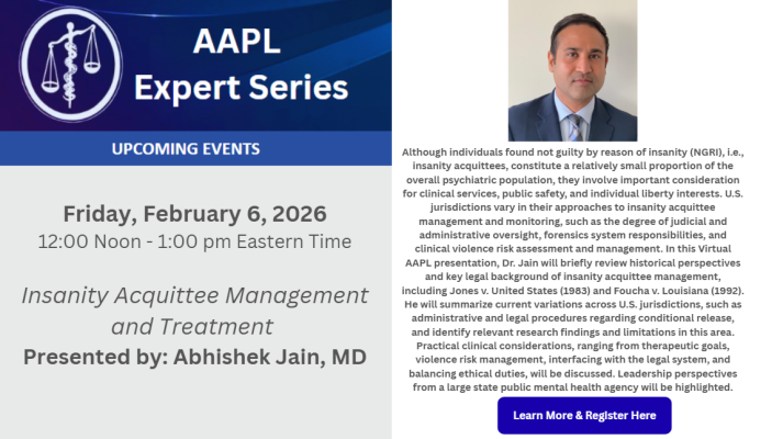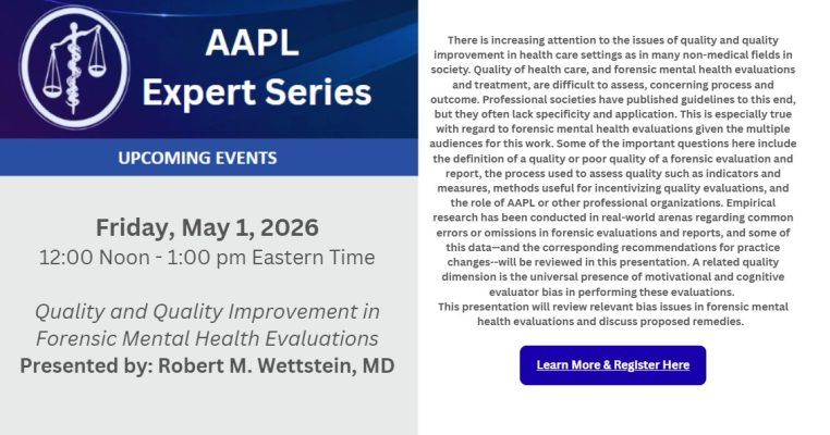 The AAPL Friday Expert Series webinars are insights into specific forensic psychiatry cases and issues presented by leading forensic psychiatry experts.